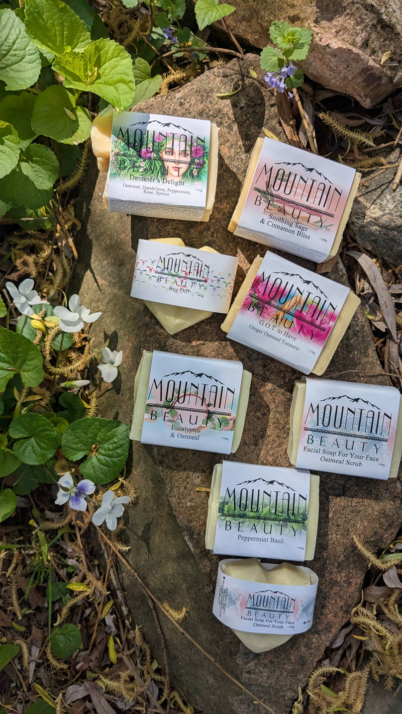 All soaps contain Lanark County Maple Syrup. With only natural goodness, Mountain Beauty does not use artificial colours or fragrances, additives, mica, clays, or palm oil. The colours come naturally from the plants used in the soap. Enjoy your favorite scents like lavender or peppermint basil or try something new like catnip, pine resin or chaga mushroom.